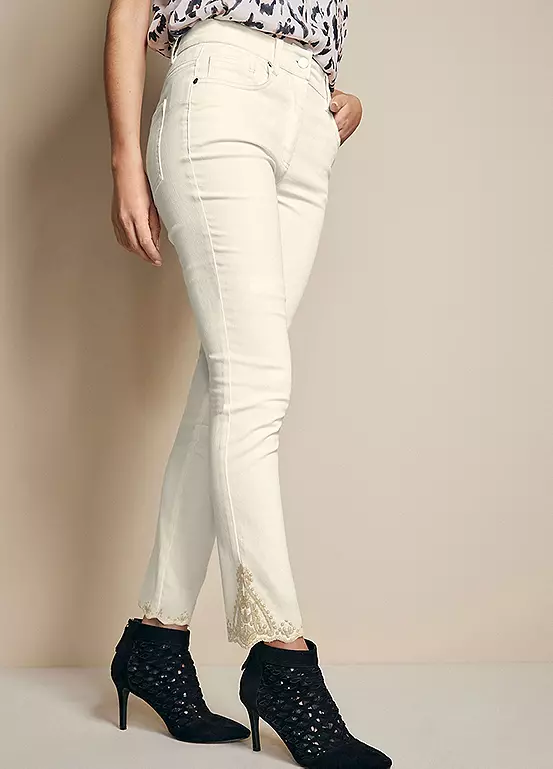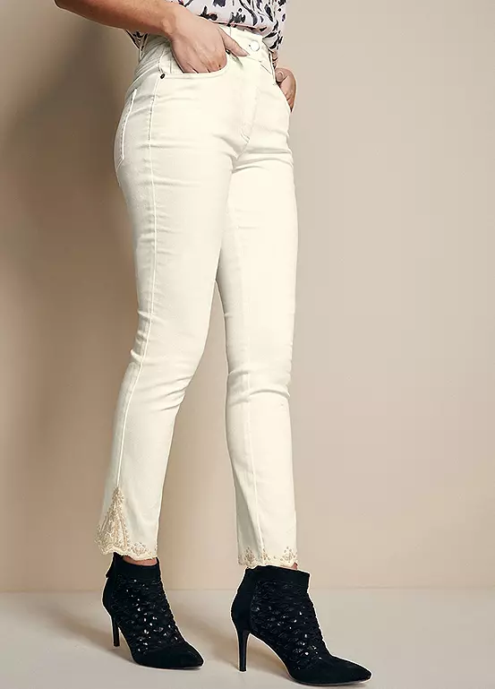 For the ultimate in casual style, our slim-fit jeans are a perfect addition to your weekend wardrobe. With a gorgeous embroidered hem these flattering jeans are an essential item for this season!