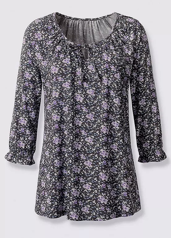 Floral patterned tunic top in flattering wide A-line shape and supple soft fabric. Decorative pleats at the rounded neckline with small V-neck and tie. Three-quarter length raglan sleeves with elastic and subtle ruffle on the hem.