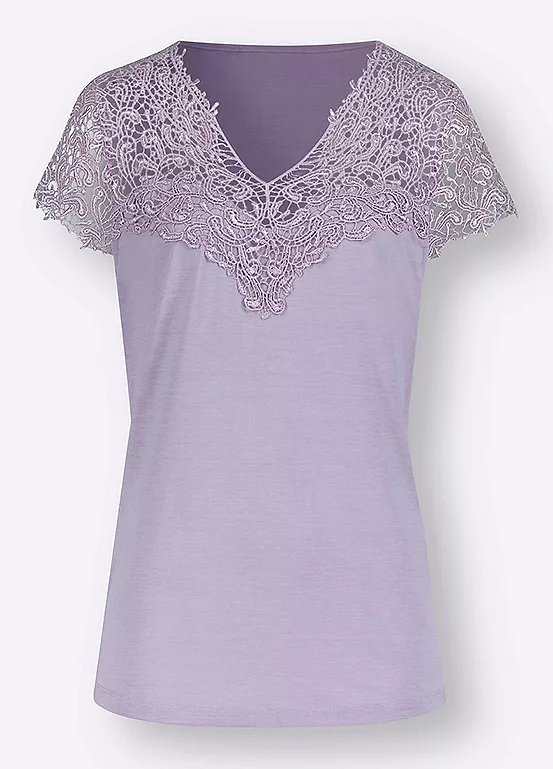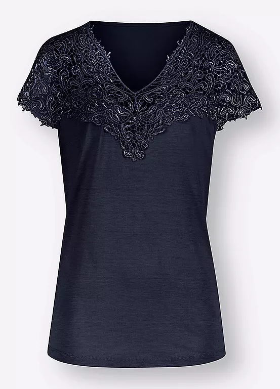 The delicate, sheer lace on the front and on the sleeves makes this t-shirt so irresistible.